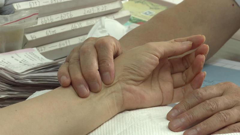 清晨的阳光透过窗户洒进门诊部三七堂,屋内,老中医朱胜典正端坐诊桌前为患者诊脉。他手指轻搭患者腕间,凝神细诊,询问病情细节。桌旁,两位年轻医师屏息凝神,手中的笔记本记得密密麻麻。