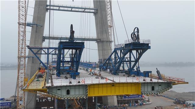 据现场技术员伍粤介绍,目前大桥南岸主塔施工已全部完成,全面进入上部构造施工阶段。正在进行的是6号钢箱梁的焊接和6号斜拉索梁端入锚,累计完成6对斜拉锁和15片钢箱梁的安装。预计年底完成边跨整体落梁以及边跨合龙。