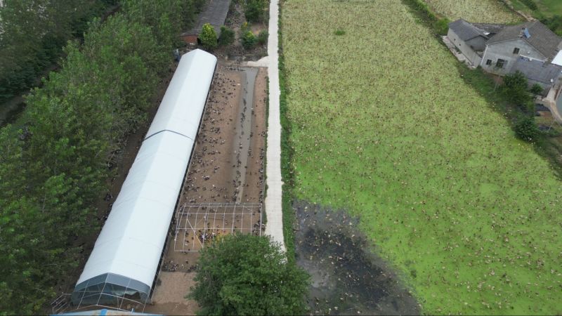 “鸭鹅屋里的粪便会供应给周边的农户肥田用,场地上的粪便会经过排水系统进入藕池肥藕,藕又可以净化水质,基本上无污染。”廖援助说道。