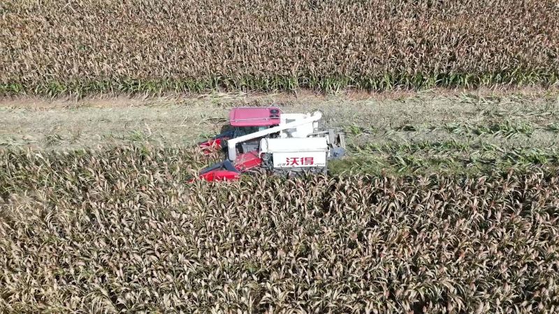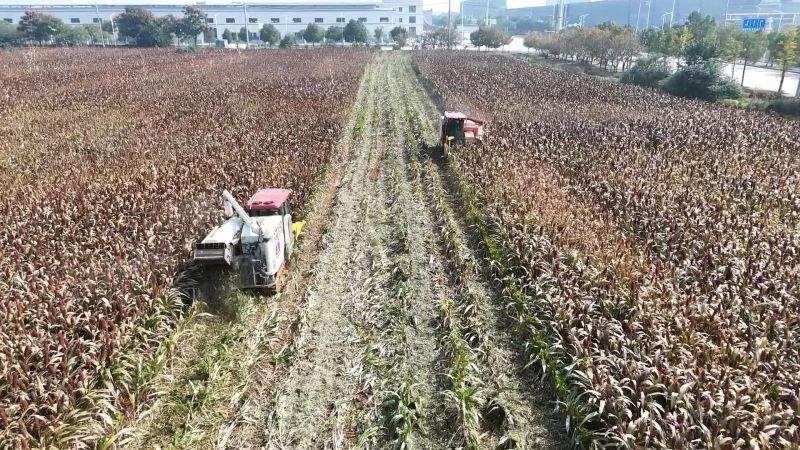 收割现场,三台大型收割机在田间来回穿梭,伴随着收割机的轰鸣声,一株株高粱连秆带穗卷入其中,收割、摘穗、脱粒、秸秆粉碎、装车……一气呵成,在阳光的照射下,交织成一幅生动的农收画卷。