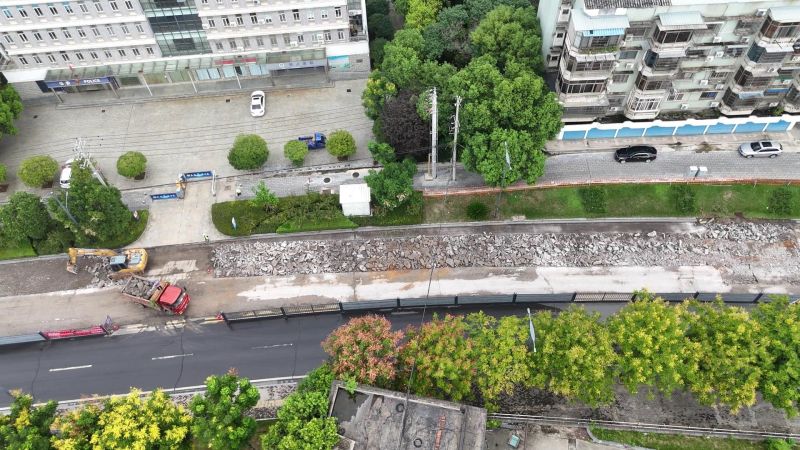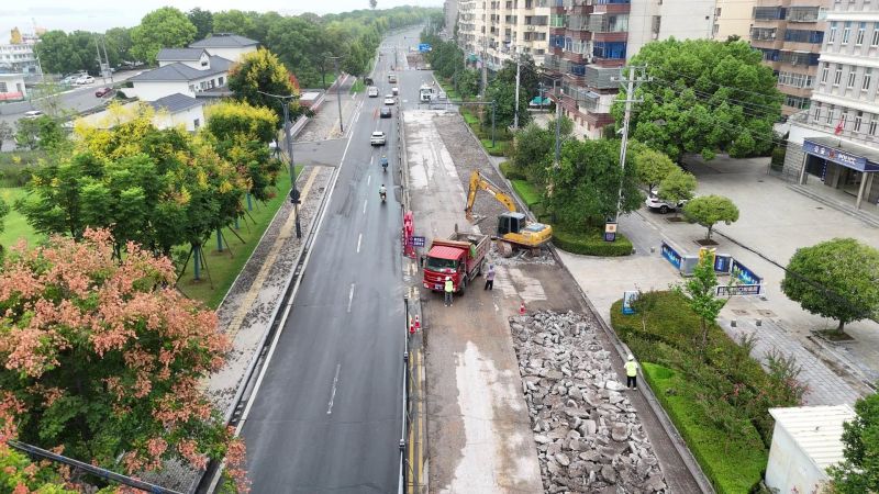 在沿江大道施工现场,挖掘机轰鸣着破除路面,堆积的碎石被及时清运,工程车与挖掘机配合默契,加紧进行沟槽土方开挖作业,施工人员身着反光背心在现场忙碌。这样的施工场景在城区多条道路同步上演。
