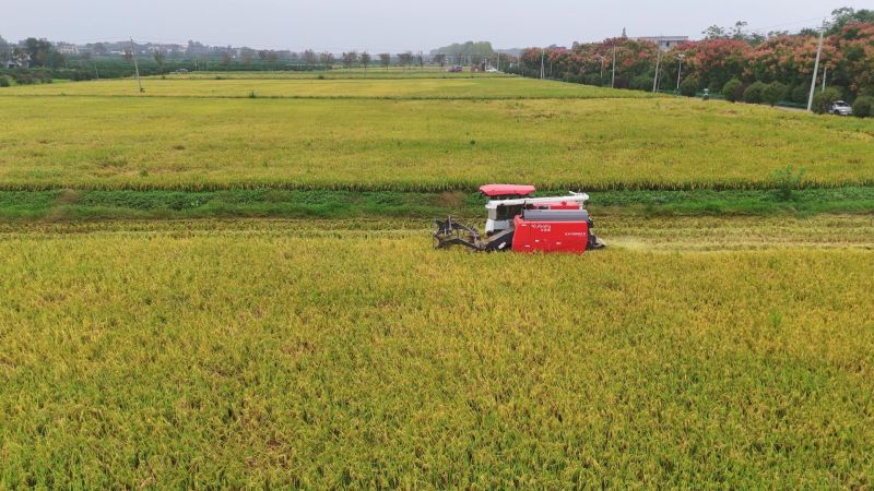 在仙女镇九龙村宜昌鸿耀农业种植专业合作社的稻田里,沉甸甸的稻穗压弯了稻秆,数台高性能联合收割机正在金黄的稻浪中来回穿梭,一派繁忙的丰收景象。