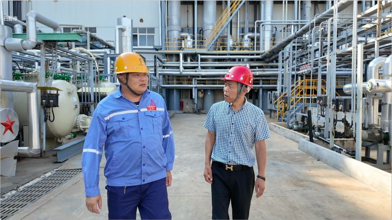 下午三点,烈日炙烤下的姚家港化工园区热浪蒸腾。徐玉忠正在车间内仔细检查设备的运行状况,并和一旁的工作人员交流操作细节,这样的场景已成为他的工作日常。