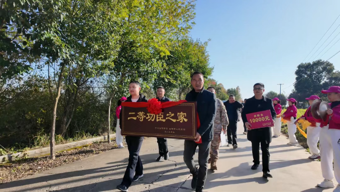 欢快的锣鼓声中,军地相关负责人共同将“二等功臣之家”荣誉牌匾、喜报以及奖金送至朱渊海家属手中,并为他们佩戴“一人立功 全家光荣”绶带。同时,感谢家属多年来发挥的“坚强后盾”作用,希望他们能一如既往地鼓励支持朱渊海在部队安心服役,努力工作,为国防事业作出更大贡献。