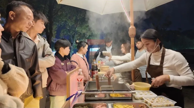 除了摊位规划,安全保障也同步升级。夜市全面取消液化气、酒精炉等高危器具,统一安装智能充电桩,扫码即可供电,每个摊位均配备灭火器,油污类摊位还安装了油烟净化器。同时,市建投集团还开发“信义码”平台,实现交易现金流实时追踪。市建投集团副总经理徐涛说:“他们获得了摊位经营许可证以后,我们建投集团统一免费办理健康证,试运营期间第一天大概有5万元的收益,昨天大概有二十个摊位的收益都突破千元以上。”